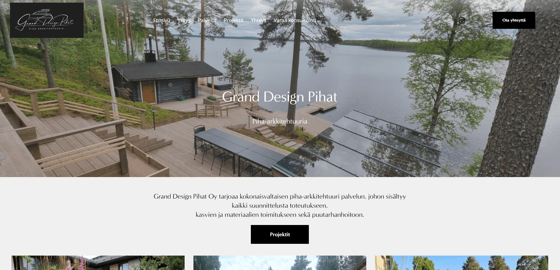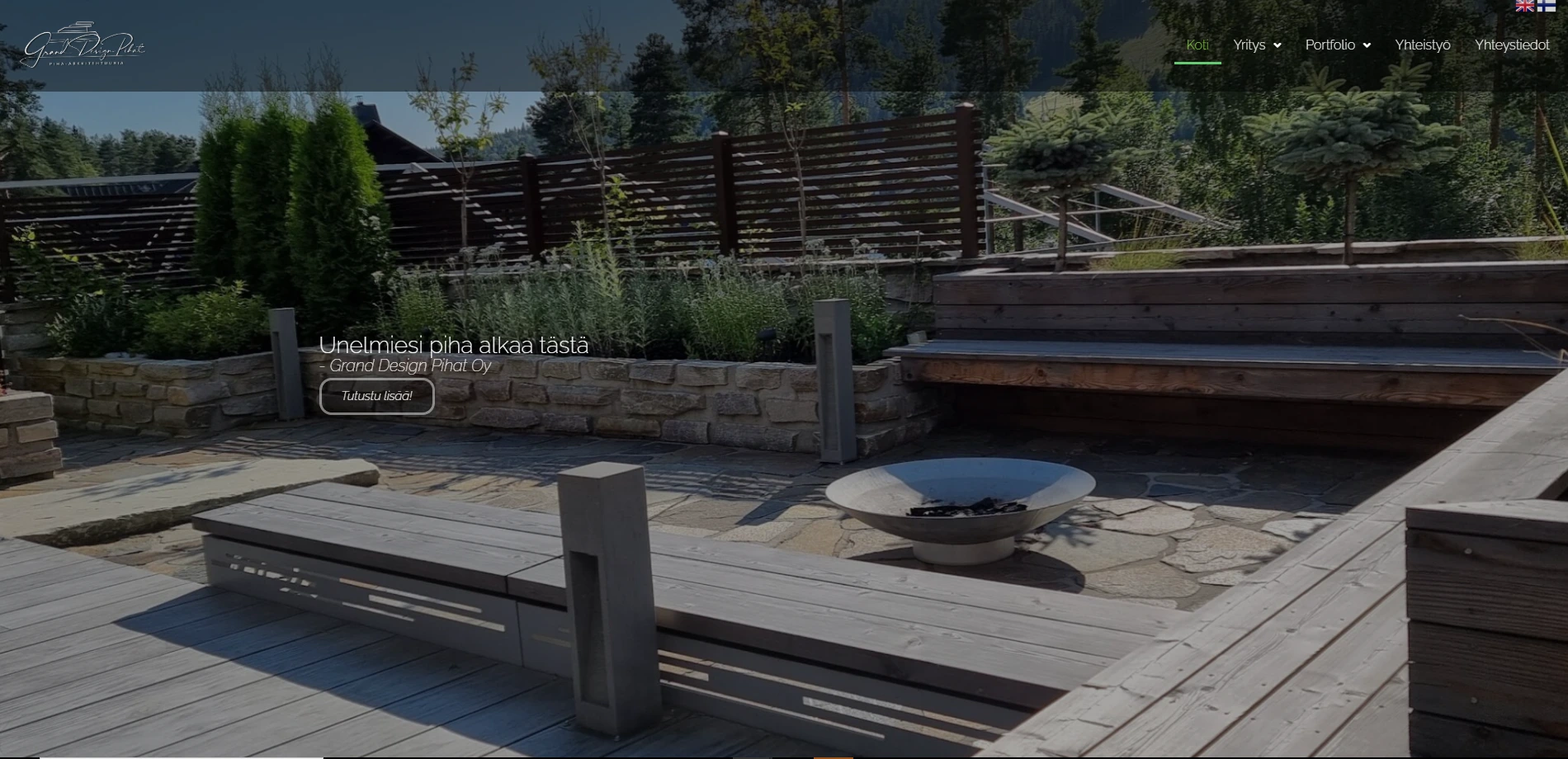 Grand Design Pihat is a company specializing in garden design and landscaping in Finland. Their old website no longer matched the quality of the company and didn't work well on mobile devices. The goal was to create a modern, visually impressive website that reflects the company's expertise.